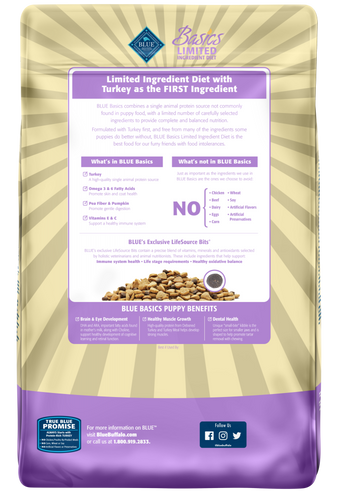 BLUE Basics Dog Food is a delicious, limited-ingredient diet made from fewer ingredients selected with care, that may prove helpful to dogs with food sensitivities. All BLUE Basics recipes start with real meat from a single animal protein source not often used in dog food, plus they include pumpkin and easily digested carbohydrates. BLUE Basics puppy formula contains ingredients like DHA to support your puppy’s healthy growth and development at this crucial life stage.