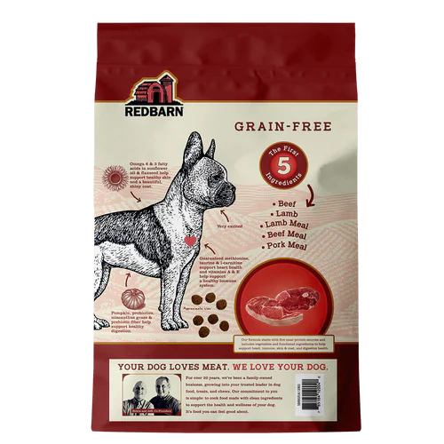 If your dog loves meat, they’ll love Redbarn’s Grain-Free Dry Dog Food. The first FIVE ingredients in all three recipes are meat, fish, or poultry, depending on the recipe. Animal protein is the best source of protein for our pups, and these Grain-Free recipes will help support your dog’s overall health, wellness, and longevity into their senior years. But the goodness doesn’t stop there — each scoop of dry food contains carefully selected functional ingredients. Pumpkin, prebiotics, and probiotics help support healthy digestion; sunflower oil and flaxseed support healthy skin and a beautiful, shiny coat; and guaranteed levels of taurine, l-carnitine, and methionine support heart health. It’s your dog’s new, well-balanced nutrition plan in a few convenient scoops!For over 25 years, Redbarn Pet Products has been a family-owned business, growing into your trusted leader in treats, chews, and food. From then through now, Redbarn’s commitment to pet parents is simple: to cook food made with clean ingredients to support the health and wellness of your dog. It’s food we all feel good about.